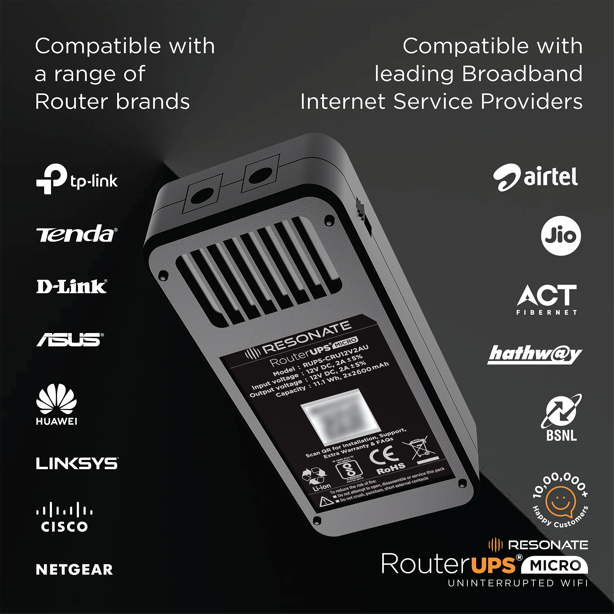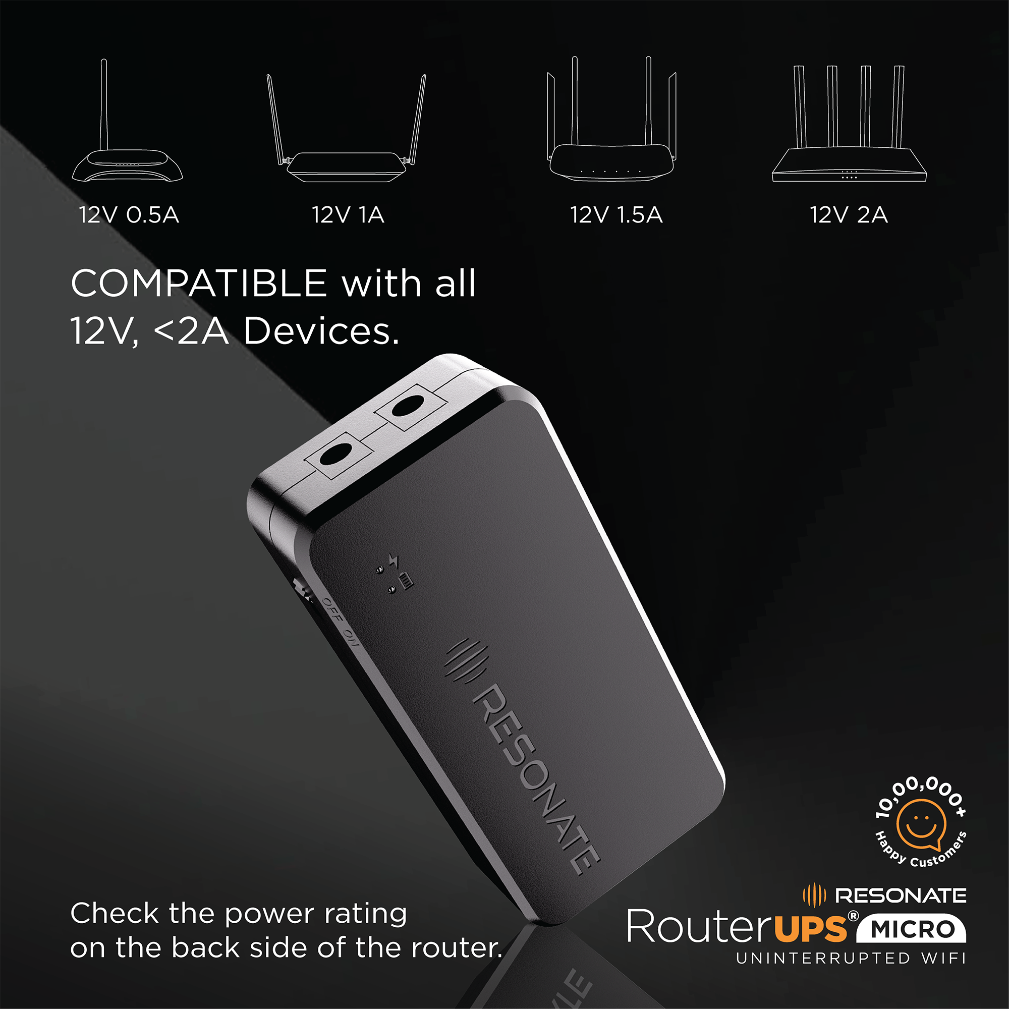 Resonate RouterUPS® Micro | Up to 3 Hrs Backup | Compact Mini UPS for 12V WiFi Routers & Modems (≤2A) | Intelligent Charging, CE/ROHS/BIS Certified