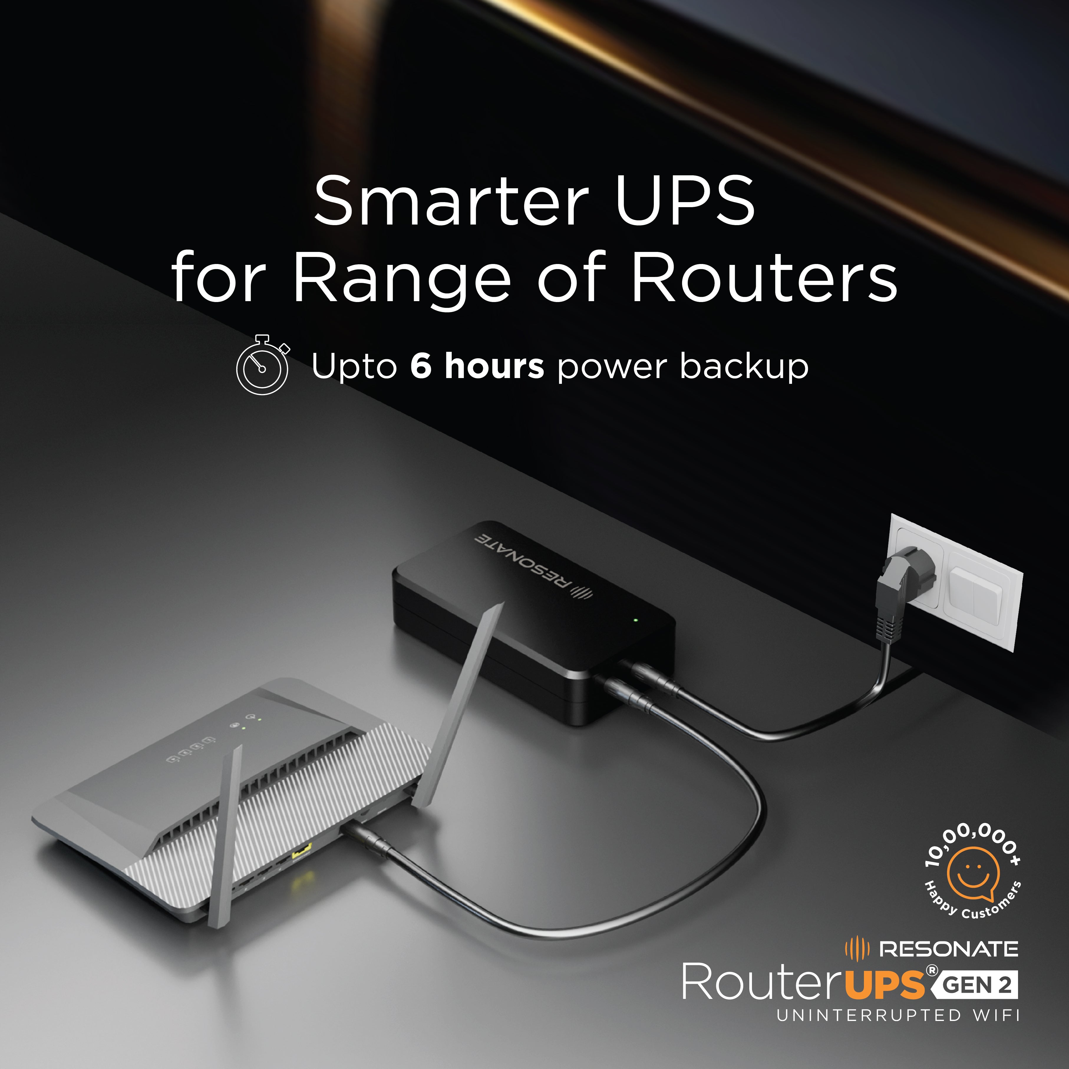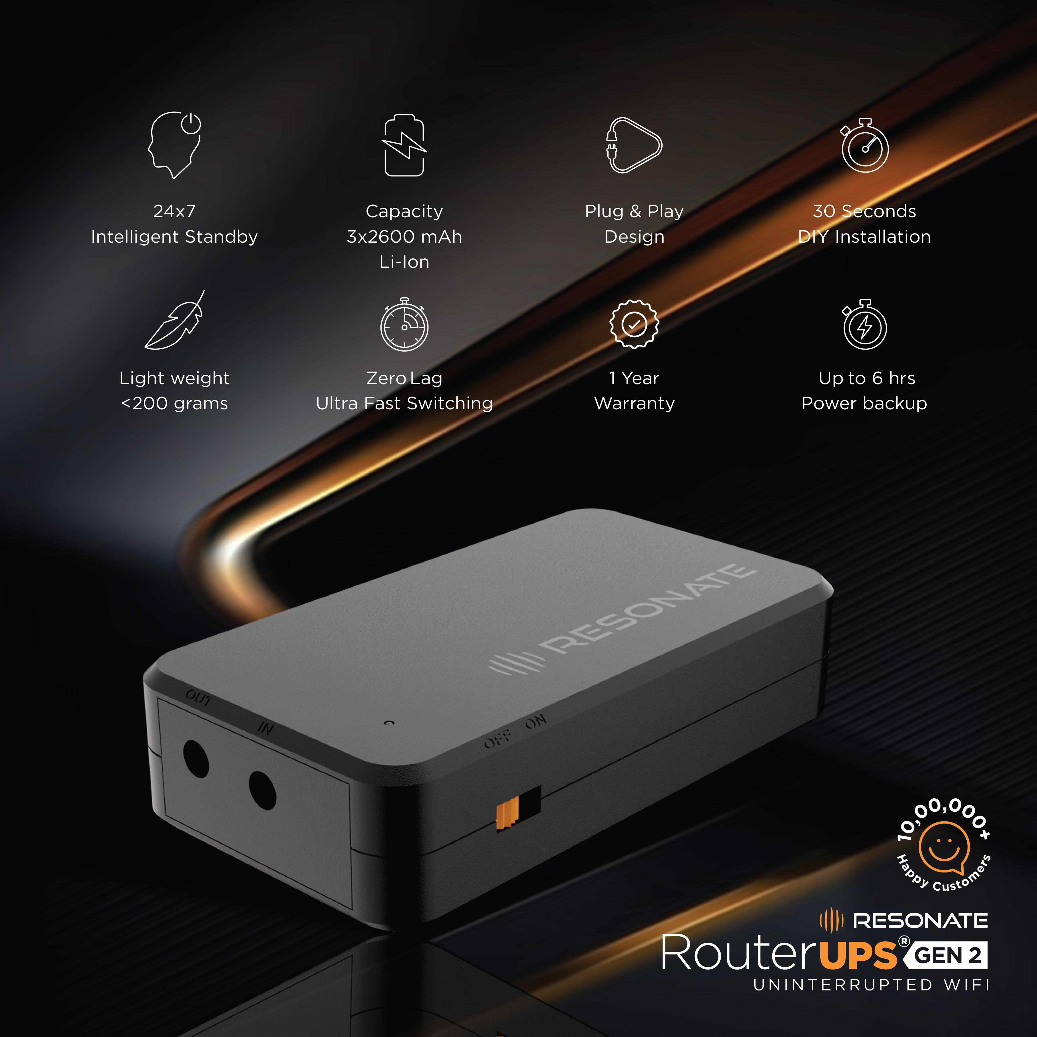 Resonate RouterUPS® Gen2 keeps your WiFi router, FTTH, set-top boxes, IoT devices, and other 12V gadgets running seamlessly during power cuts. With 3×2600mAh batteries, it provides up to 6 hours of uninterrupted backup. Plug-n-play design ensures 30-second installation and zero-drop internet for work, study, gaming, and entertainment.